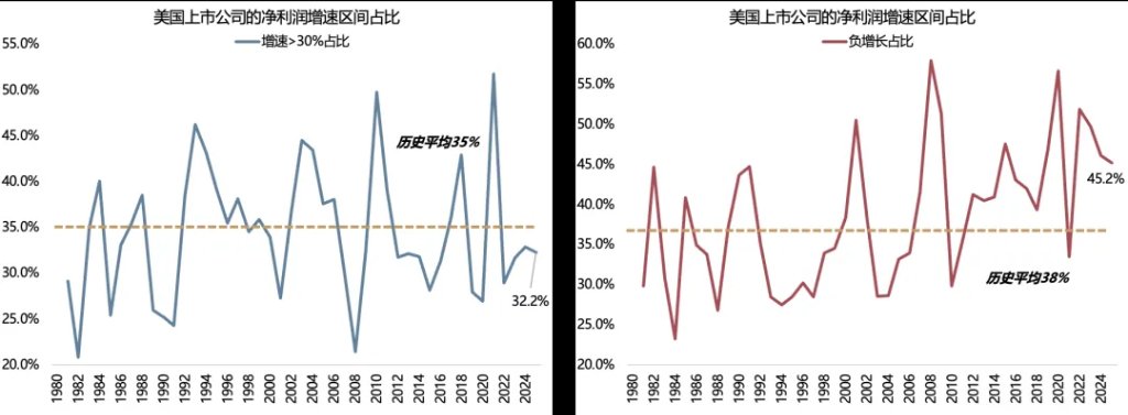 美股牛市虽然已持续了3年,但盈利高增长的公司仍然是稀缺的,当前(截至202511)美股上市公司净利润增速>30%的比例为32%,低于历史均值的35%;同时,负增长的比例为45%,高于历史均值的38%。