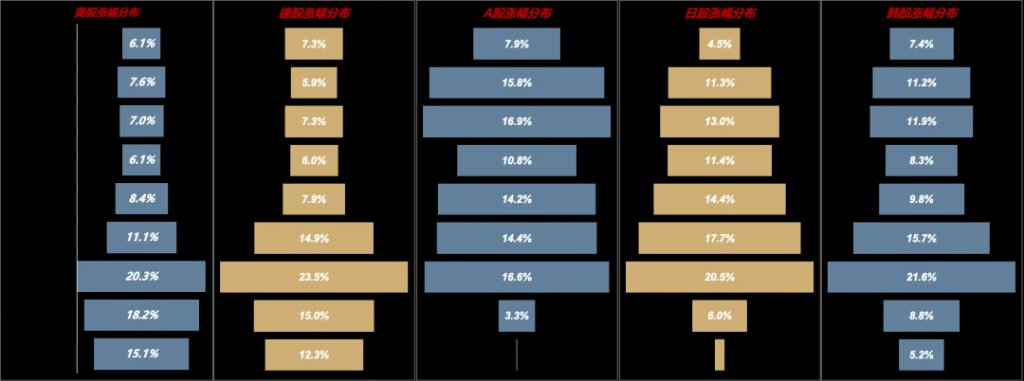 (1)上涨结构:“二八分化”。美国、德国、日本、韩国股市,2025年下跌个股占比56%、51%、29%、35%; A股有一定普涨特征,下跌比例仅为18%。