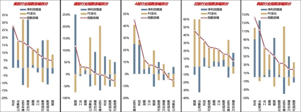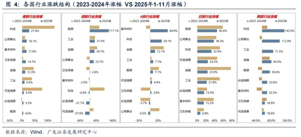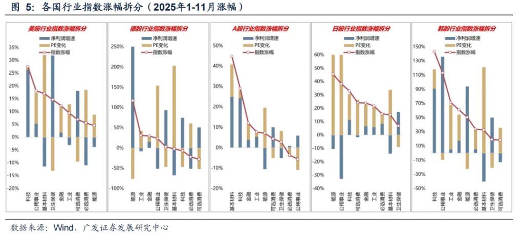 另外,全球牛市的背后,估值贡献了很大一部分,但领涨的板块多数都有强劲的盈利支撑。比如,2025年1-11月,美国涨幅第一的科技板块,上涨26.7%、盈利增长26.4%、估值贡献0.9%;韩国涨幅第一的科技板块,上涨143.0%、盈利增长90.9%、估值贡献27.3%。