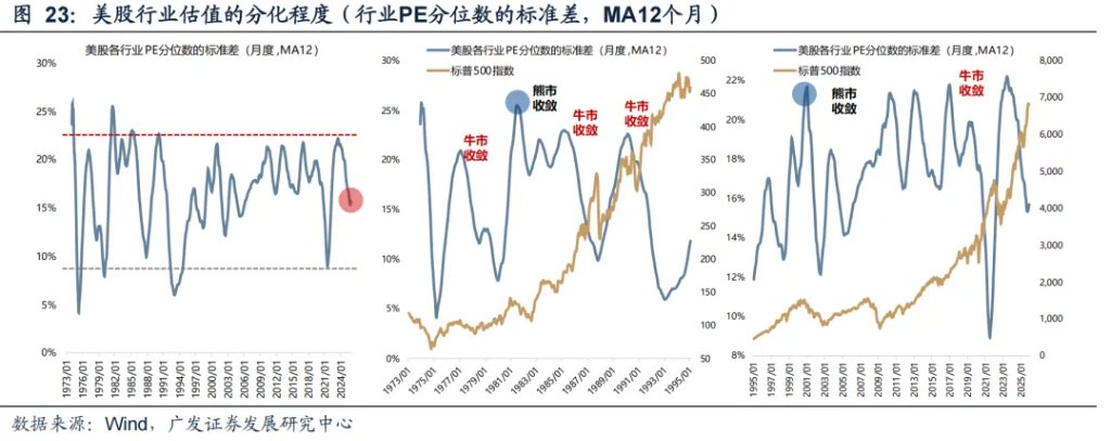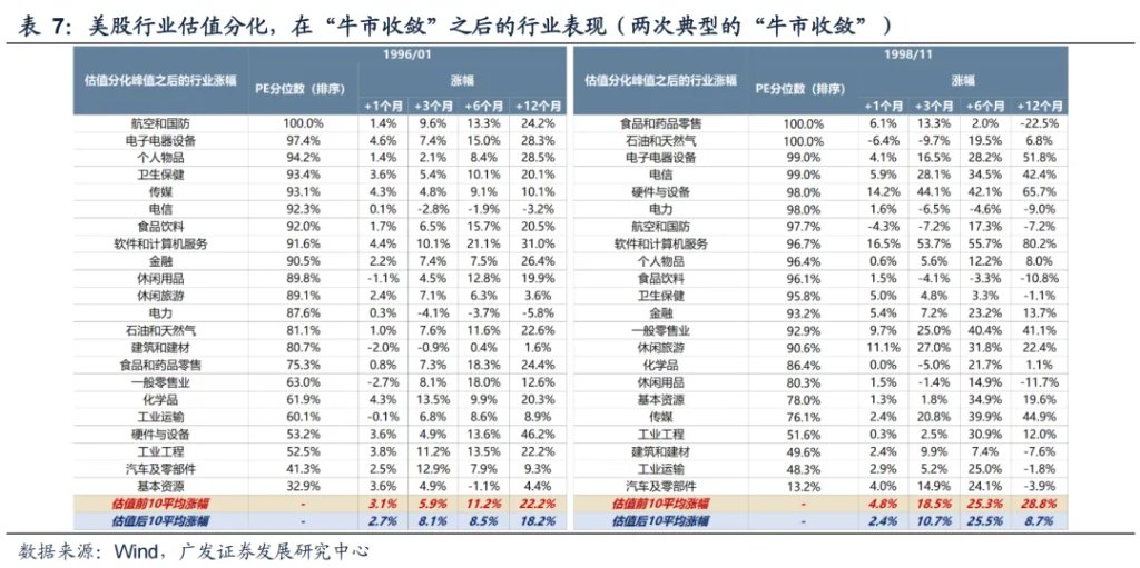 美股行业估值的分化与收敛,也有一些规律性特征: