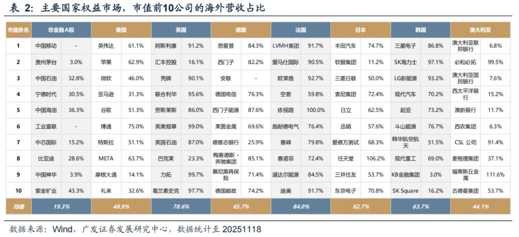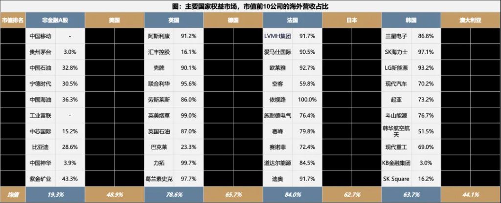 主要国家权益市场,市值前10的非金融公司,绝大部分高度全球化,海外营收占比在60%甚至90%以上,集中在科技、制造、资源、可选等行业,金融、必选等通常偏低。相比之下,目前非金融A股,大市值公司的海外营收占比仍然偏低,这也是A股市值集中度偏低的重要原因之一。