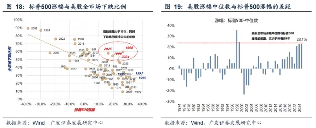 (3)2024-2025年(截至当前):加息周期结束后,通胀回落、经济未衰退、就业韧性强,但从市场表现看,这一阶段的上涨结构,并不是典型的“金发女孩”特征,股市的涨跌结构很极致——指数大涨(涨幅超过15%)+全市场下跌比例过半——同时存在,更像“金发女孩”后半段的1998-1999年。