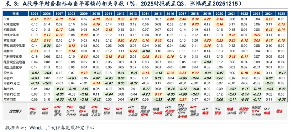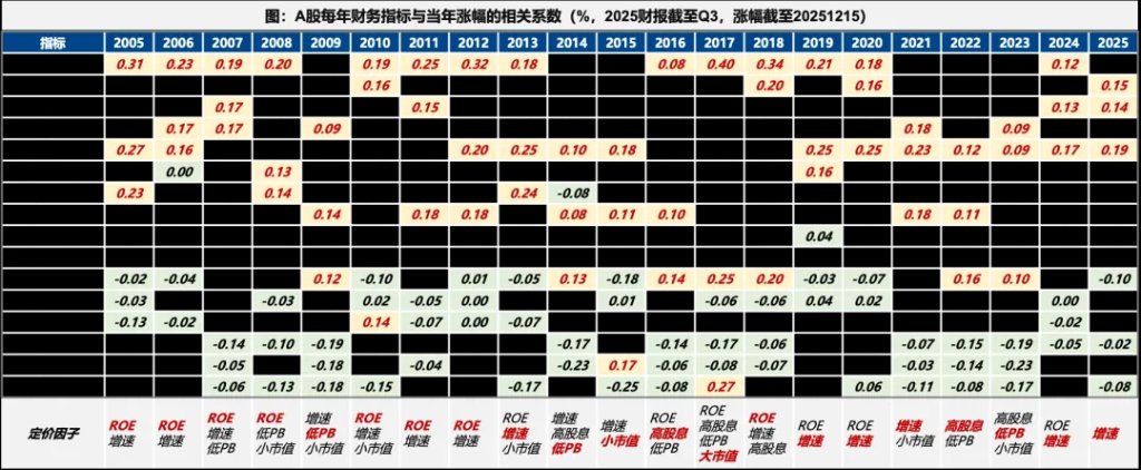 2025年,A股的景气定价更加极致,且具有排他性。(1)以往年份,整体上看,最有效的财务指标是:ROE、净利润/营收增速、PB、股息率;(2)各类定价因子会出现明显的轮动,但每一年,通常会有两个及以上突出的风格;(3)但2025年,景气因子(增速)的有效性显著强于其他财务因子。