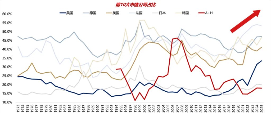 全球主要权益市场,市值集中度(市值前10的本土上市公司的占比),大多数在30%-50%之间。外向型国家或地区的市值集中度更高。比如,新加坡市值前10占比达到60%、中国台湾市值前10占比达到58%,意大利、法国、波兰等国的前10市值占比也在50%以上。