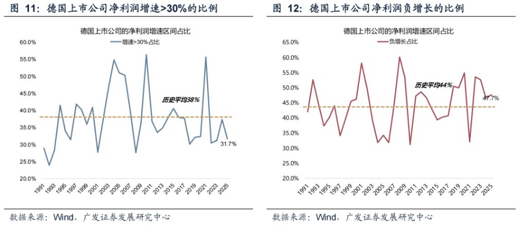 德国的盈利结构也较弱,当前(截至202511)德国上市公司净利润增速>30%的比例为31.7%、负增长的比例达到47.7%,均比历史平均水平要弱,特别是2025年的整体盈利情况并未比上一年改善。
