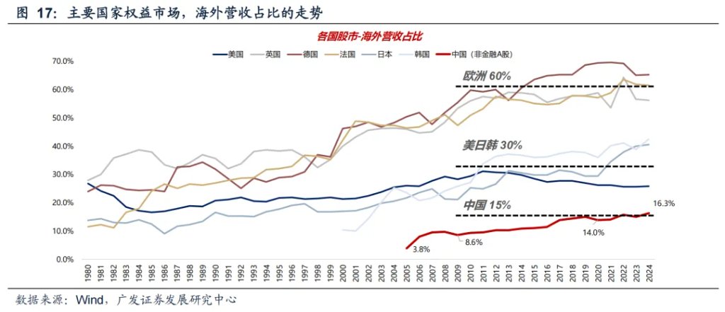 (4)A股海外收入占比,过去20年持续提升,但和主要发达国家相比,占比仍低。海外营收占比分三个梯队:一是欧洲(外需/出海大国),海外营收占比中枢在60%;二是美日(内需也有较强支撑),中枢在30%;三是中国(内需/外需大国),中枢在15%。