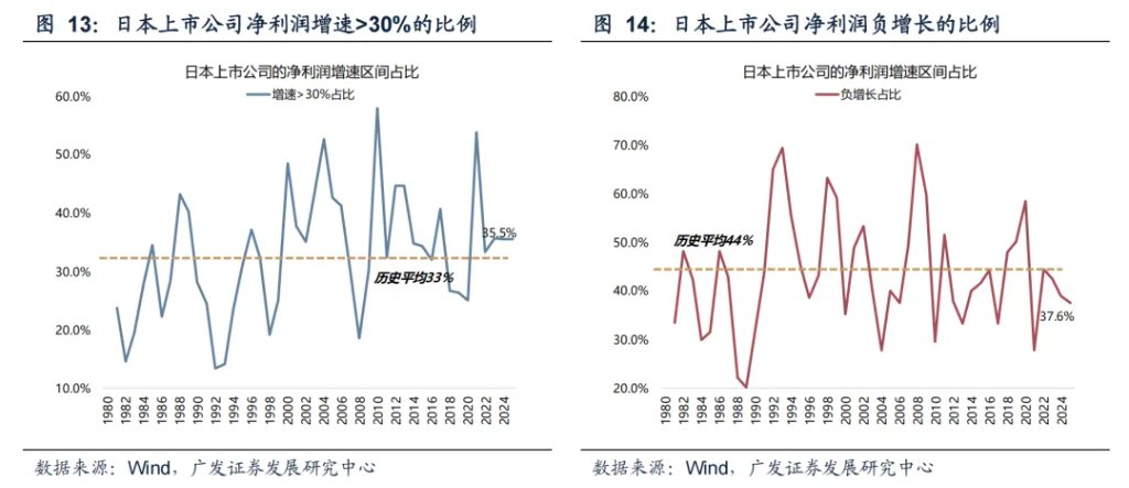 日本的盈利结构相对好些,当前(截至202511)日本上市公司净利润增速>30%的比例为35.5%、负增长的比例达到37.6%,均略好于历史平均水平。