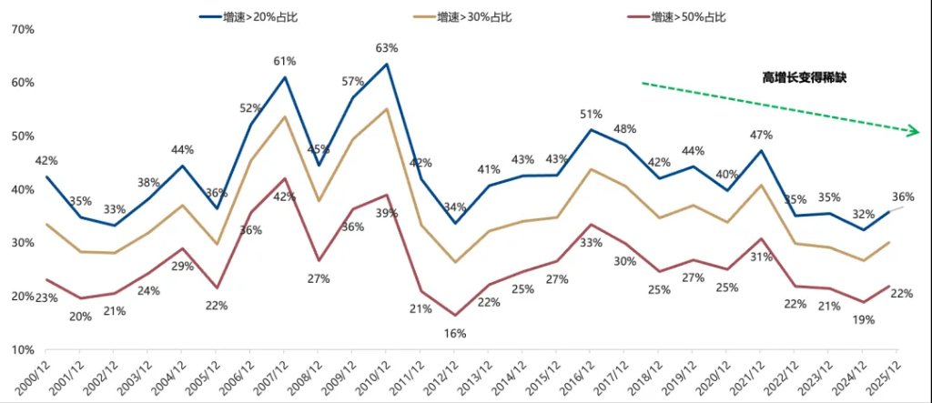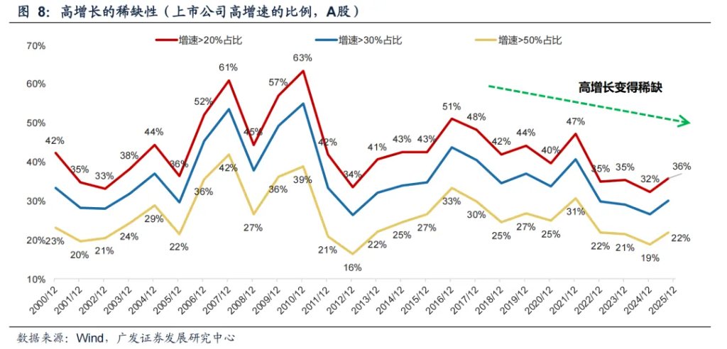 (1)经济周期平坦化之后,高增长的资产变得越来越少。A股增速>20%的公司占36%,往年中枢约45%。