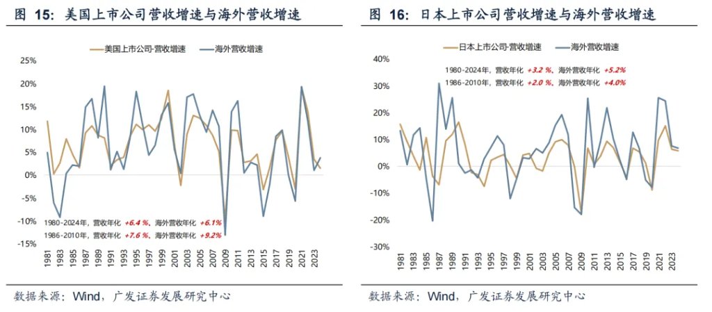 (3)全球化是持续增长的来源。全球化高增长主要集中在80年代中后期到2010年,以及2020年之后的非美国家。1986-2010年,美国/日本/德国/英国/法国上市公司:营收的年化增速分别为 +7.6%/ +2.0%/ +5.4%/ +7.8%/ +7.5%、海外营收的年化增速为+9.2%/ +4.0%/ +6.4%/ +8.7%/ +9.1%。