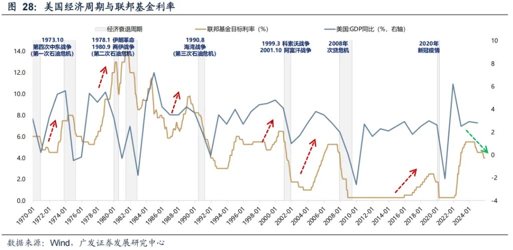 历史上看,美国的衰退周期,通常是发生在加息周期的末端;而在降息周期中,货币和财政政策,有更多对冲空间,较少形成衰退情形。