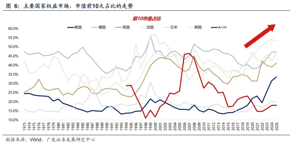 2025年全球牛市呈现“结构分化”与“高增长稀缺”两大特征。多数市场呈现“二八分化”,仅少数个股上涨,而领涨的科技与资源品板块均有强劲盈利支撑。与此同时,全球股市市值集中度普遍创新高,但中国上市公司市值集中度显著偏低,这与其企业全球化程度不足、海外营收占比较小直接相关,突显了当前市场对可持续高增长资产的极致追逐。