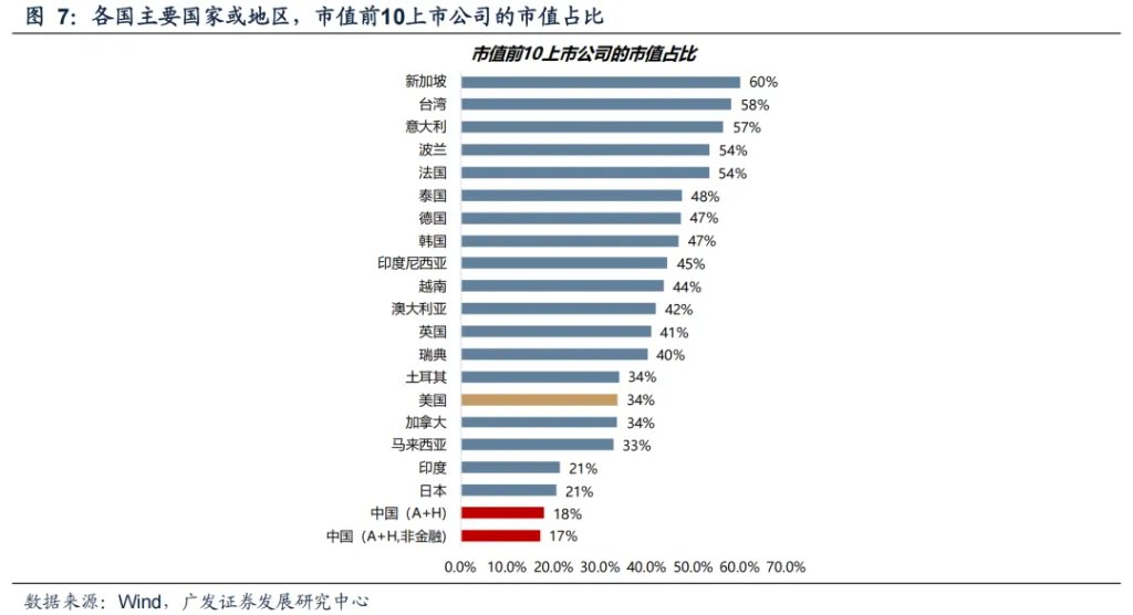 另外,发展中国家的市值集中度相对较低,比如越南的44%、马来西亚的33%、印度的21%。而,中国(包含A股+港股中资股)上市公司的市值集中度最低,目前仅为18%;非金融部分的集中度更低,仅为17%。