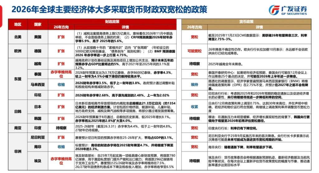 展望2026年:预计美联储在2026年降息两次;欧洲央行可能按兵不动,因德国财政刺激带来的增长;日本央行因其通胀担忧、且日元贬值压力加大,或成为唯一加息的主要央行;新兴市场多数也在宽松周期中,但可能仅小幅宽松,反映其外需有支撑但内需偏弱。