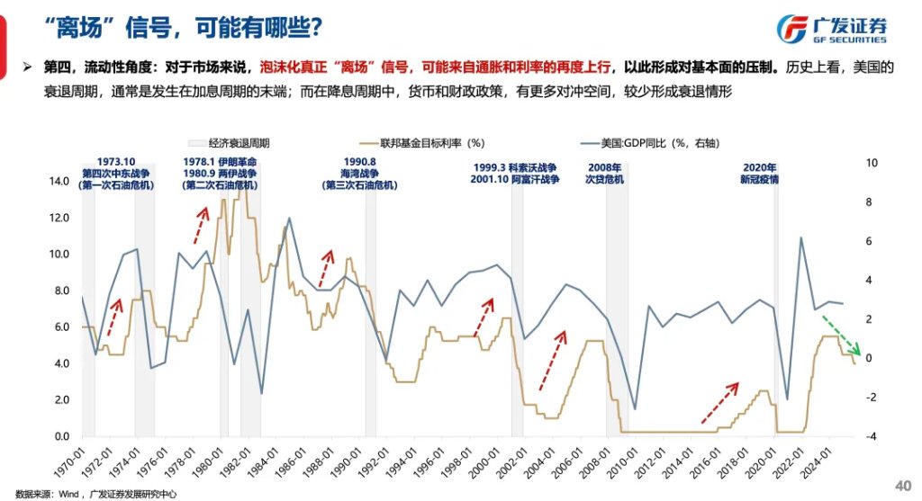 (3)泡沫化真正“离场”信号,可能来自通胀和利率的再度上行,以此形成对未来基本面的压制。而在降息周期中,尤其叠加中期选举,货币和财政政策,有更多对冲空间,较少形成衰退情形。