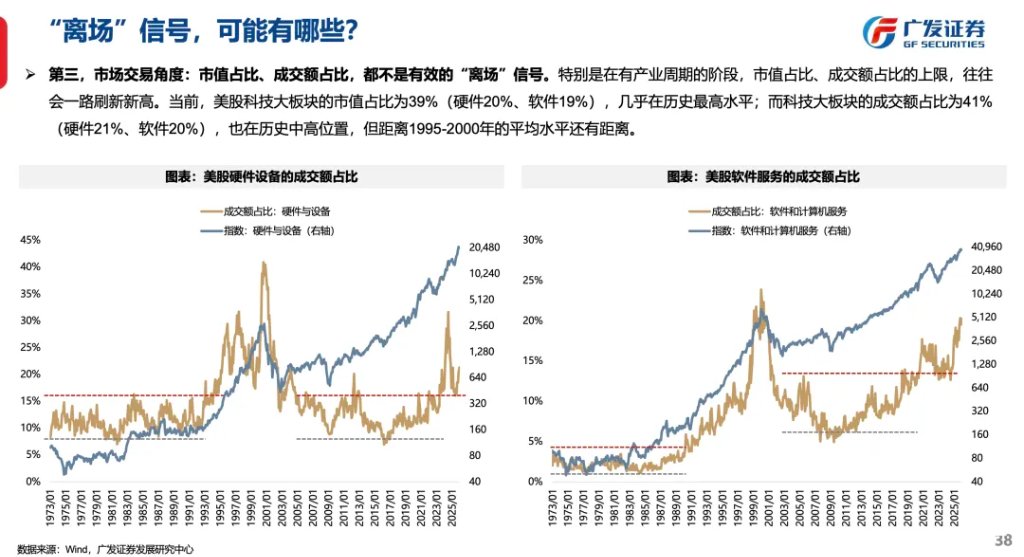 而科技大板块的成交额占比为41%(硬件21%、软件20%),也在历史中高位置,但距离1995-2000年的平均水平还有距离。
