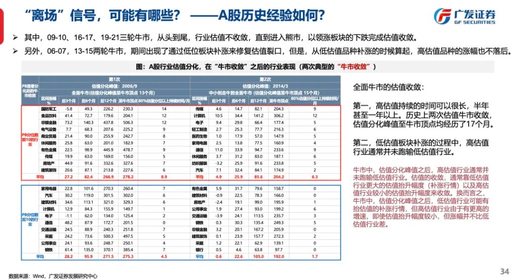 (2)“离场”信号,可能有哪些? ①行业涨幅离散程度、②估值离散程度、③市值占比、④成交额占比,均不是有效的“离场”信号。其中,美股过往估值极致分化之后,仅有两次典型的熊市收敛(1881年加息末期/衰退;2000年加息末期/衰退),其余12次均是牛市收敛。而牛市中的估值收敛,高估值板块往往也表现很不错,不会跑输低估值的补涨。